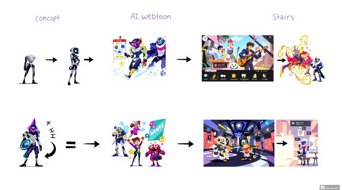 - AI 스토리 보드 생성: AI가 웹툰의 줄거리를 짜고, 콘티(스토리보드)를 생성하는 기술입니다. ChatGPT, Claude 등과 같은 AI 모델이 사용됩니다.